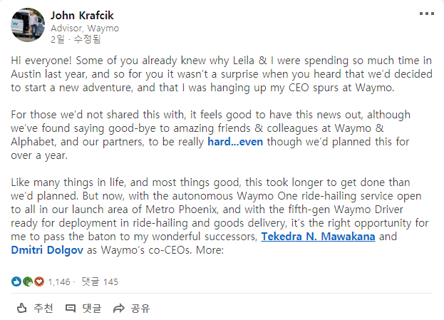 5일 업계에 따르면 크래프칙 웨이모 CEO는 지난 2일(현지시간) 본인의 SNS 계정을 통해 사임 의사를 밝혔다. 테케드라 마와키나 최고운영책임자(COO)와 디미트리 돌고프 최고기술책임자(CTO)에게 공동 CEO를 맡기기로 했다. 향후 고문으로 활동한다. 이는 이미 1년 전부터 준비된 계획이다.