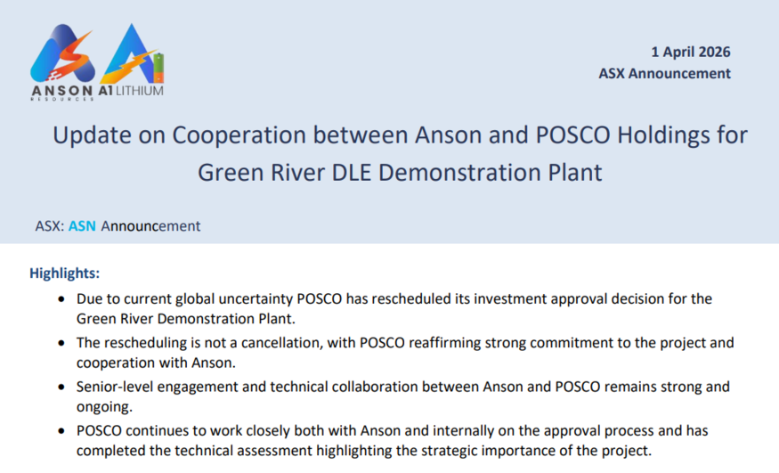 2일 앤슨 리소시스(Anson Resources) 공시에 따르면 포스코홀딩스는 미국 유타주 '그린 리버(Green River) DLE 실증 플랜트'에 대한 내부 투자 승인 결정을 재조정했다. 당초 올해 1분기 내 투자 여부를 확정할 방침이었다. 지난해 말에 이어 이번이 두 번째 일정 조정이다. 지난해 6월 앤슨 리소시스와 DLE 기술 실증을 위한 업무협약(MOU)을 체결하며 북미 리튬 공급망 구축에 속도를 냈던 사업이 약 1년 만에 본격적인 속도 조절에 들어간 것이다.