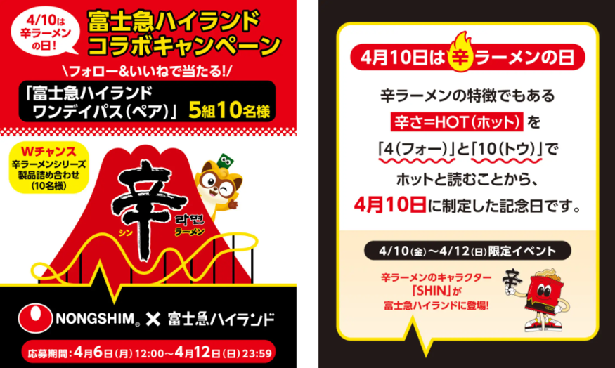 7일 농심재팬에 따르면 올해 기념일을 맞아 일본 대표 테마파크 '후지큐 하이랜드'와 협업한 SNS 캠페인을 진행한다. 오는 12일까지 X(구 트위터)와 인스타그램 공식 계정을 통해 응모한 고객 중 총 40명을 추첨, 후지큐 하이랜드 이용권과 신라면 제품 세트 등을 증정한다.