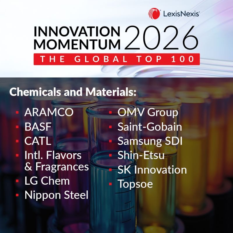 7일 국 지식재산권(IP) 솔루션 전문 서비스 기업 렉시스넥시스(LexisNexis)에 따르면 △삼성SDI △LG화학 △SK이노베이션은 최근 렉시스넥시스가 발표한 '혁신 모멘텀 2026: 글로벌 100대 기업(Innovation Momentum 2026: The Global Top 100)' 보고서의 화학 및 재료 분야 리더로 선정됐다. 렉시스넥시스는 단순히 보유한 특허 수량을 나열하는 방식에서 벗어나, 최근 2년간 특허의 기술적 가치와 시장 내 영향력을 종합적으로 평가하는 '특허 자산 지수(Patent Asset Index)'를 기준으로 매년 상위 100개 기업을 선정하고 있다.