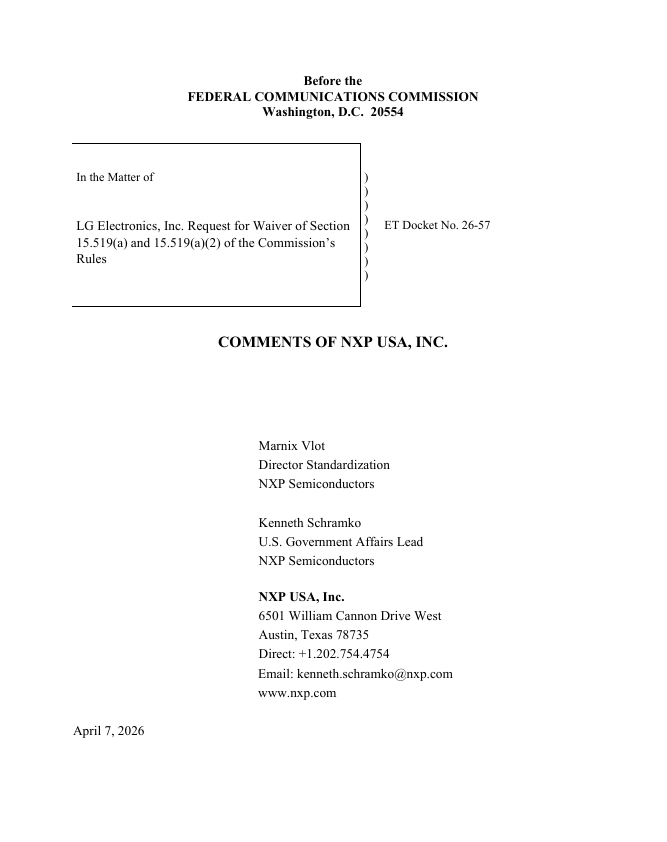10일 NXP USA가 미국 연방통신위원회(FCC)에 제출한 공식 의견서에 따르면 NXP는 LG전자가 신청한 UWB 규제 면제(Waiver) 요청(Docket 26-57)을 승인해 줄 것을 FCC에 강력히 촉구했다. LG전자는 앞서 6-10GHz 대역에서 작동하는 UWB 기술을 고정형 스마트 도어락에 사용할 수 있도록 허가해달라는 신청서를 제출한 바 있다. 현행 FCC 규정은 UWB 장치를 주로 휴대용으로 제한하며 실외 고정형 인프라 설치를 금지하고 있으나 , LG전자는 기술적 보완책을 근거로 예외 인정을 요구해 왔다.