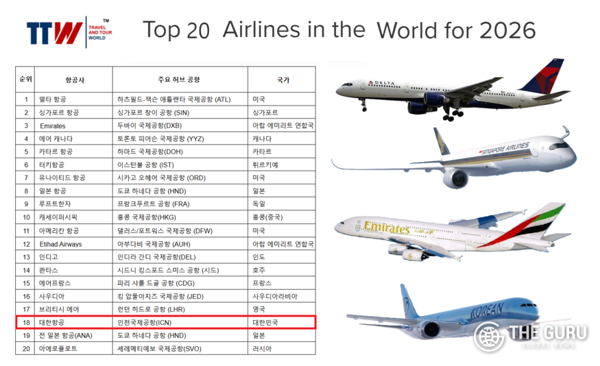 20일 트래블 앤 투어 월드(TTW)에 따르면 대한항공은 '2026년 세계 50대 항공사(Top 50 Airlines in the World for 2026)' 조사에서 종합 18위를 기록했다. TTW는 대한항공이 서울 인천국제공항을 전략적 허브로 삼아 북미와 유럽, 아시아를 잇는 균형 잡힌 네트워크를 구축하고 있다는 점에 주목했다.