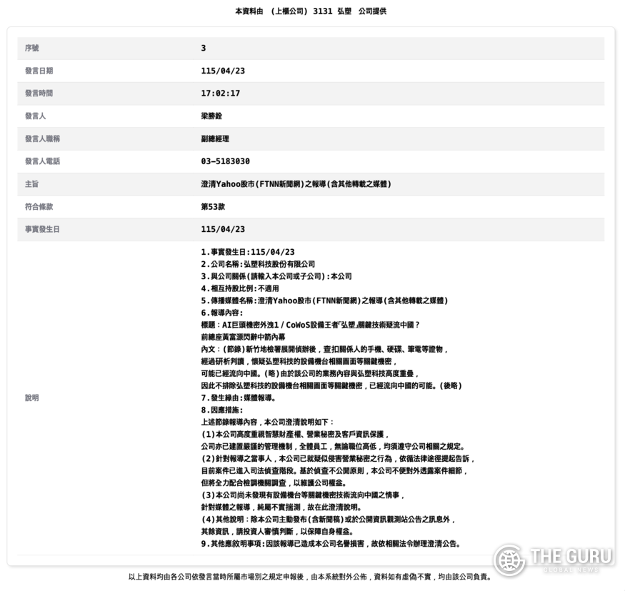 [더구루=정예린 기자] TSMC의 대만 첨단 패키징 장비 협력사 'GPTC(중국명 弘塑)'가 전직 사장의 영업비밀 침해 사태와 관련해 제기된 중국 기술 유출 의혹을 전면 부인했다. TSMC가 인공지능(AI) 반도체 수요 폭증에 맞춰 첨단 패키징 생산능력 확충에 속도를 내고 있는 가운데 핵심 파트너사의 보안 리스크가 불거지며 공급망 관리에 경고등이 켜졌다.
