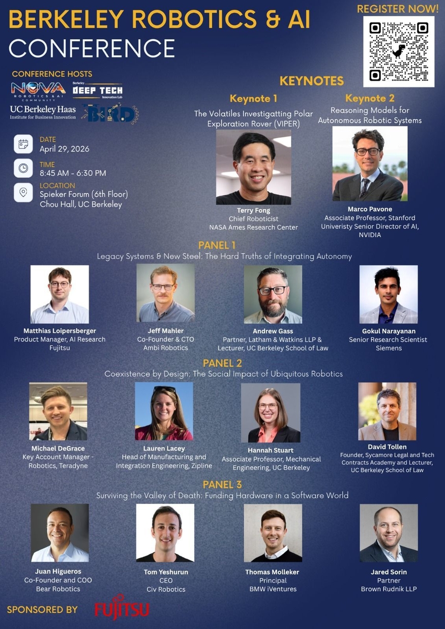 버클리 로보틱스 & AI 컨퍼런스는 UC 버클리 산하 딥테크 혁신 연구소 등이 주최해 기술 상용화와 자율 시스템 통합 등 실전 과제를 조명하는 자리다. 테리 퐁 미국 항공우주국(NASA) 수석 로봇 공학자와 마르코 파보네 엔비디아 AI 선임 디렉터의 기조연설을 비롯해 지멘스, 테라다인, BMW i 벤처스 등 유력 기업 및 투자사가 대거 집결한다.