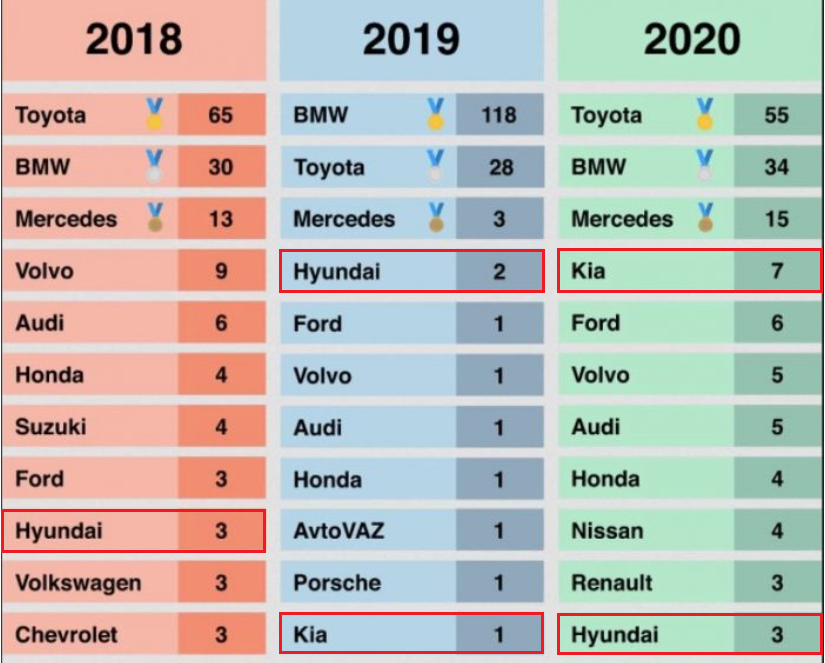 토요타는 BMW를 제치고 1년 만에 1위를 탈환했다. 이어 BMW와 메르세데스-벤츠가 각각 2위와 3위를 각각 기록했다. 기아에 이어 포드와 볼보, 아우디, 혼다, 닛산, 르노가 '톱10'에 이름을 올렸다.