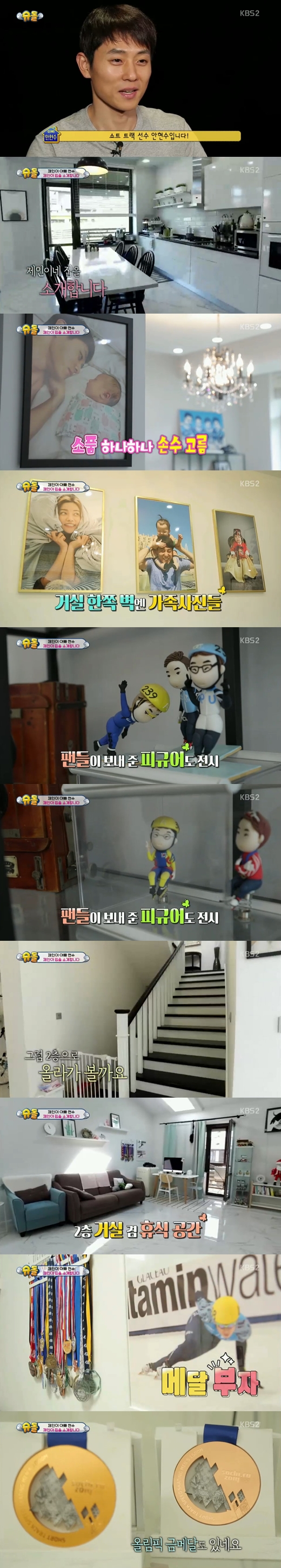 또 집의 한 쪽에는 팬이 선물한 피규어와 함께 안현수가 각종 대회에서 획득한 메달이 장식되어 있어 눈길을 끌었다. 메달 중에는 소치 올림픽 금메달도 있었다.