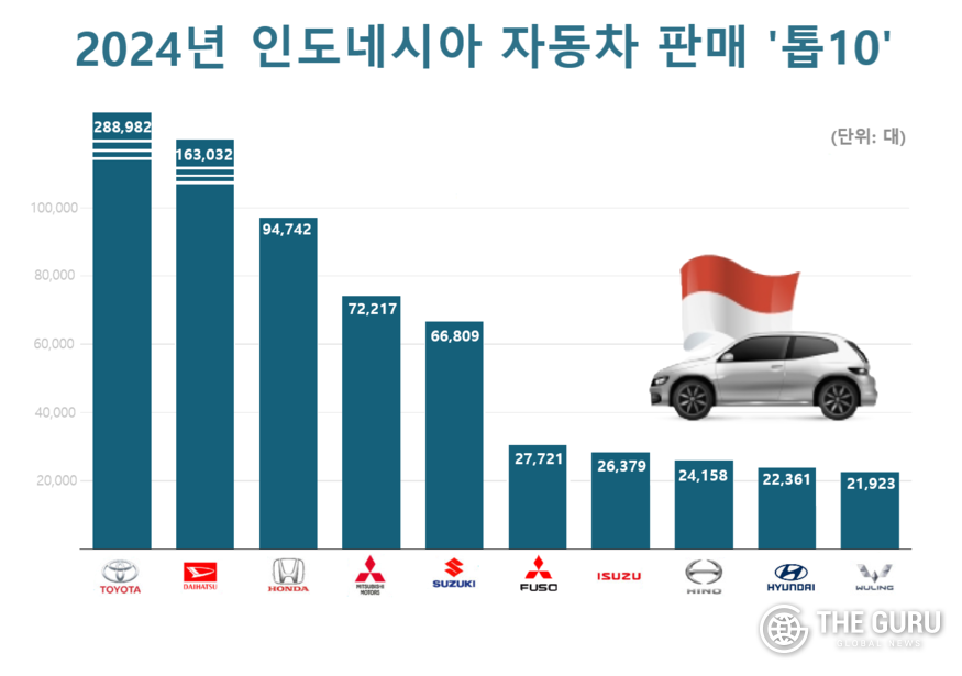 같은 해 1위부터 8위까지는 모두 일본 브랜드가 휩쓸었다. 1위는 토요타가 차지했다. 같은 해 총 28만8982대를 판매했다. 다이하츠는 16만3032대로 2위, 혼다는 9만4742대로 3위를 기록했고, 이어 미쓰비시와 스즈키가 각각 7만2217대와 6만6809대로 4위와 5위에 랭크됐다. 6위부터 8위는 △후소(2만721대) △이스즈(2만6379대) △히노(2만4158대) 순으로 이어졌다. 울링(2만1923대)은 중국 브랜드 중 유일하게 톱10 목록에 이름을 올렸다. 현대차에 이어 10위를 기록했다.