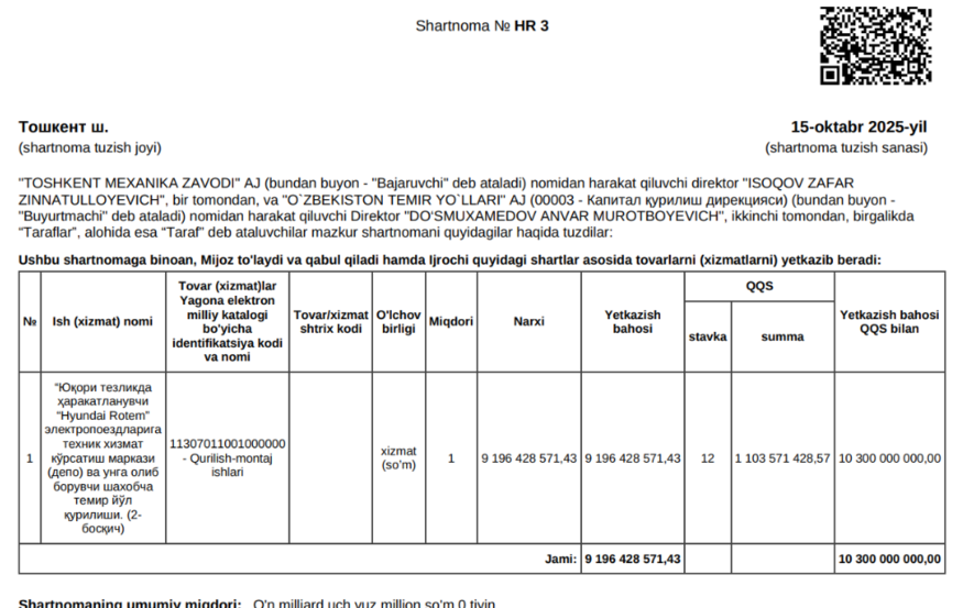 22일 우즈벡 정부와 플라티나 등 외신에 따르면 우즈베키스탄 철도청(O‘zbekiston Temir Yo‘llari AJ)은 지난 15일(현지시간) 타슈겐트 메카니카 공장(Toshkent mexanika zavodi AJ, 이하 TMZ AJ)와 현대로템 철도차량용 정비센터 2단계 건설 사업 계약을 체결했다. 계약 규모는10억3000만 숨(약 10억8000만원)이다.