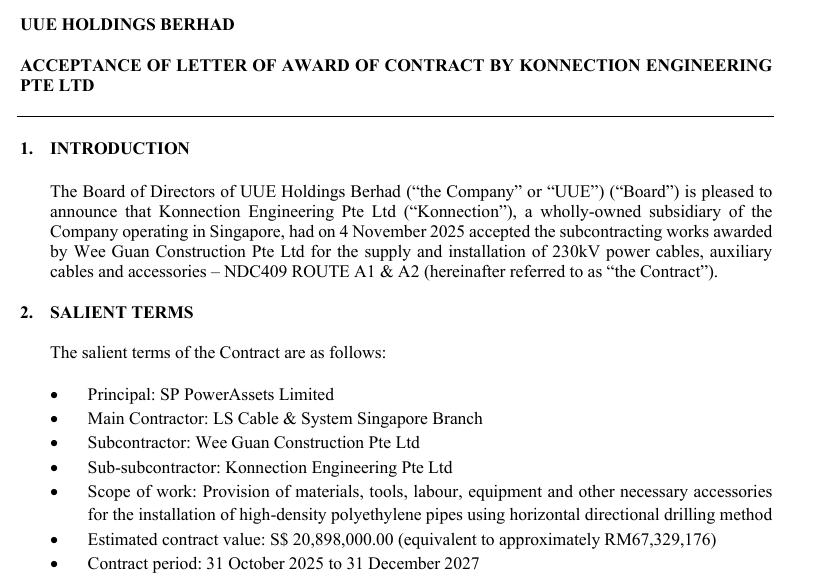 4일(현지시간) 부르사 말레이시아 증권거래소에 따르면 인도네시아 UUE 홀딩스의 싱가포르 자회사 커넥션 엔지니어링은 위관 건설(Wee Guan Construction Pte Ltd)로부터 230㎸급 초고압 케이블 시공 하도급 계약을 수주했다. 계약 규모는 2089만8000싱가포르 달러(약 230억원)며 계약 기간은 2025년 10월 31일부터 2027년 12월 31일까지다.