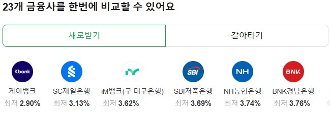 다른 은행 금리를 비교하면 상당히 낮은 수준이다. 같은 플랫폼의 다른 은행 금리를 보면 △NH농협은행 3.74% △KB국민은행 3.78% △하나은행 3.808% △우리은행 4.34% 등이다.