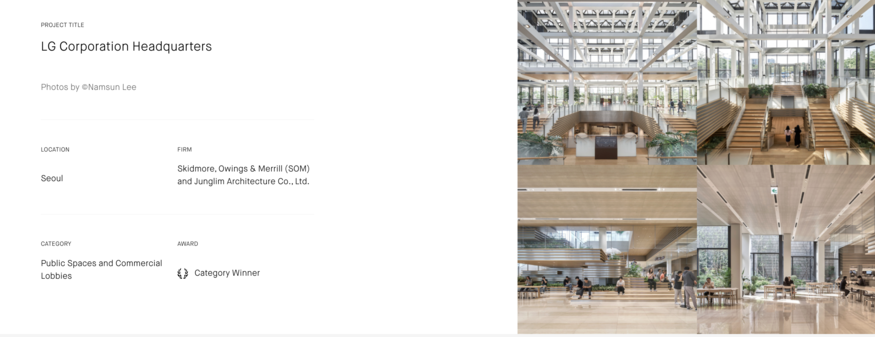 한편 이번 어워드에서는 아시아 태평양 지역의 다양한 혁신적 디자인 프로젝트들이 함께 조명됐다. 공공 공간 부문에서는 일본 도쿄 ‘아이콘 플레이스 시바코엔’이 LG트윈타워와 함께 선정됐다. 그 외에도 △인도 구르가온의 ‘디아지오 직장’(대규모 기업 공간) △싱가포르 ‘더 포티코 라운지’(소규모 기업 공간) △중국 더친의 ‘더친 메리 푸덤 호텔’(호텔) △중국 옌타이의 ‘마운틴-시 크로니클즈’(레스토랑) △광저우의 ‘완보 지구 도시 전시관’(세일즈 센터) 등이 수상 명단에 올랐다.