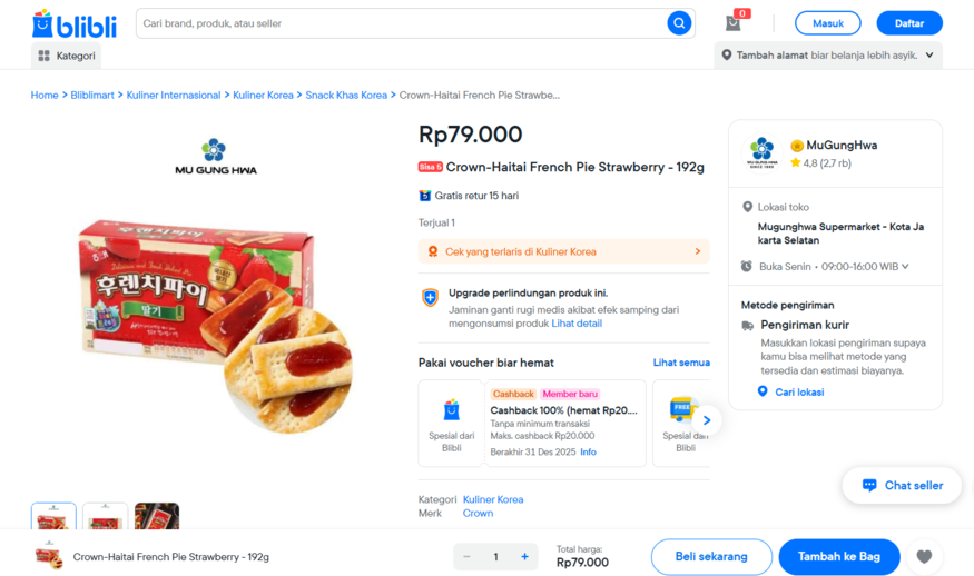 17일 블리블리에 따르면 후렌치파이는 사과·딸기 두 가지 맛으로 192g 패키지 기준 7만9000루피아에 판매되고 있다. 공급사는 한국계 인도네시아 유통업체 '무궁화'로 확인됐다. 무궁화는 자카르타 남부를 거점으로 한국 식품과 생활용품을 온·오프라인 채널에서 유통 중이다.