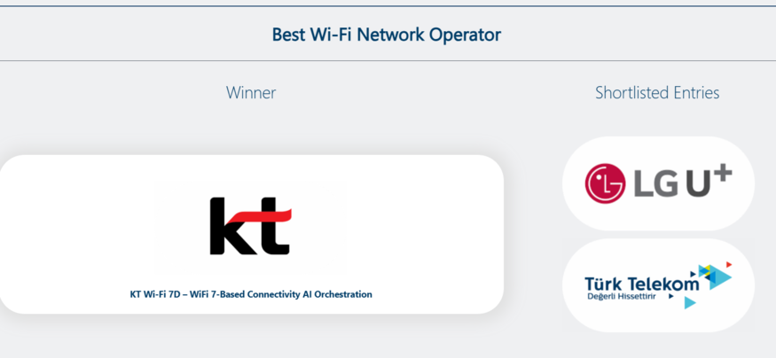 특히 WiFi 7D 기반 연결과 AI 오케스트레이션 기술은 높은 점수를 받았다. 앞서 KT는 지난해 MWC 2025에서 국내 통신사 최초로 Wi-Fi 7 표준을 지원하는 공유기 KT WiFi 7D를 공개하며 기술 혁신성을 입증한 바 있다.