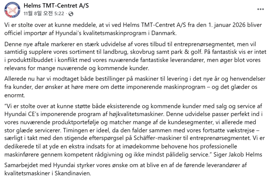 [더구루=오소영 기자] HD현대건설기계가 덴마크 '헬름스 TMT-센트렛 A/S(이하 헬름스)'를 딜러사로 선정했다. 딜러사를 추가하고 건설장비 수요가 반등하고 있는 북유럽을 공략한다.