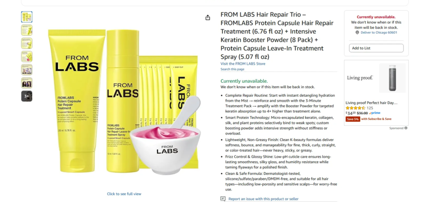 25일 프롬랩스에 따르면 지난 10월 진행된 아마존 프라임데이에서 대표 제품 중 하나인 ‘단백질 흡착 부스터 파우더’는 준비한 물량이 모두 소진되며 완판을 기록했다. ‘단백질 흡착 트리트먼트’는 ‘딥 컨디셔너(Deep Conditioners)’ 카테고리에서 상위권에 오르며 제품력을 인정받았다.