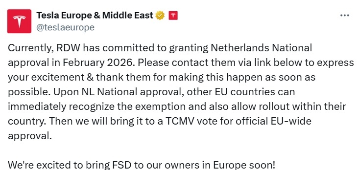 [더구루=길소연 기자] 네덜란드 교통규제당국이 테슬라의 완전자율주행인 풀 셀프 드라이빙(Full Self-Driving, FSD)의 자국 상용화를 위한 임시승인을 내년 2월로 확정했다. 테슬라는 FSD의 안전과 규제 요건을 충족해 네덜란드의 국가 승인을 얻어 유럽 전역의 상용화를 추진한다.