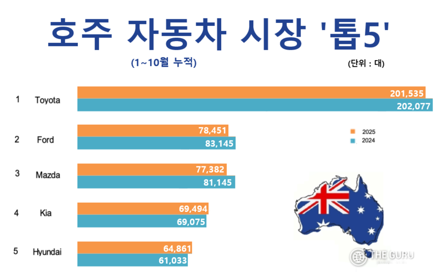 [더구루=김예지 기자] 현대자동차·기아가 올 들어 호주 시장에서 나란히 점유율을 확대하는 등 선방하고 있다. 기아는 신형 픽업 ‘타스만’ 투입 효과와 현대차의 경우 SUV 라인업 호조에 힘입어 나란히 '톱5'에 이름을 올렸다.