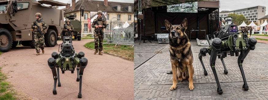 [더구루=김예지 기자] LIG넥스원이 인수한 미국 로봇업체 고스트로보틱스의 사족보행 로봇 '비전60'이 프랑스군 132 견 보병연대 소속의 숙련된 셰퍼드 군견과 '짝'을 이뤄 임무를 수행하는 혁신적인 훈련에 투입됐다. 프랑스군이 미래 전장 환경에 대비해 첨단 로봇 기술과 전통 군견의 역량을 결합한 협업 체계를 구축하는 것이다. 군 당국은 위험하고 복잡한 임무 환경에서 서로 다른 장점을 가진 두 자원의 시너지 창출 가능성에 주목했다.