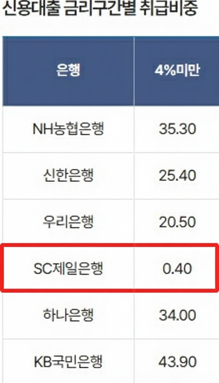 27일 은행연합회 소비자포털에 공개된 ‘신용대출 금리구간별 취급비중’을 보면, 올해 9월 기준 SC제일은행의 4% 미만 신용대출 금리 비중은 0.4%에 그친다.