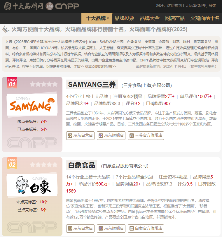 1일 중국 브랜드 평가 플랫폼 씨엔피피(CNPP)에 따르면 삼양식품은 '2025년 중국 매운라면 브랜드 톱10'에서 1위에 올랐다. 이번 순위는 CNPP가 인공지능(AI)과 빅데이터, 전문가 심층 분석, 사용자 실시간 피드백 등을 기반으로 등록 자본, 브랜드 획득 점수, 단일 제품 판매량, 브랜드 지수, 소비자 평점, 입소문 지수를 종합적으로 계산하고 정렬한 결과다.