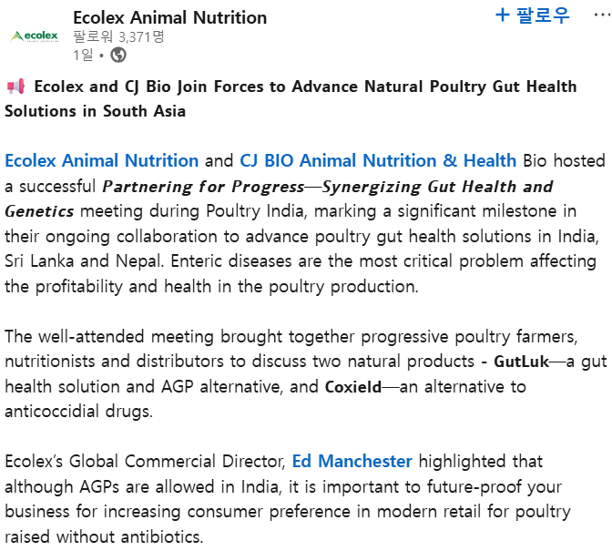 [더구루=진유진 기자] CJ제일제당이 말레이시아 사료 첨가제 전문기업 에코렉스 애니멀 뉴트리션(Ecolex Animal Nutrition·이하 에코렉스)과 협력해 남아시아 가금류 시장 공략에 속도를 내고 있다. 글로벌 축산업에서 항생제 사용을 줄이려는 흐름이 강화되는 가운데, CJ제일제당은 식물성 기반 장 건강 솔루션을 앞세워 인도·스리랑카·네팔 등에서 수요 확대를 노리고 있다.