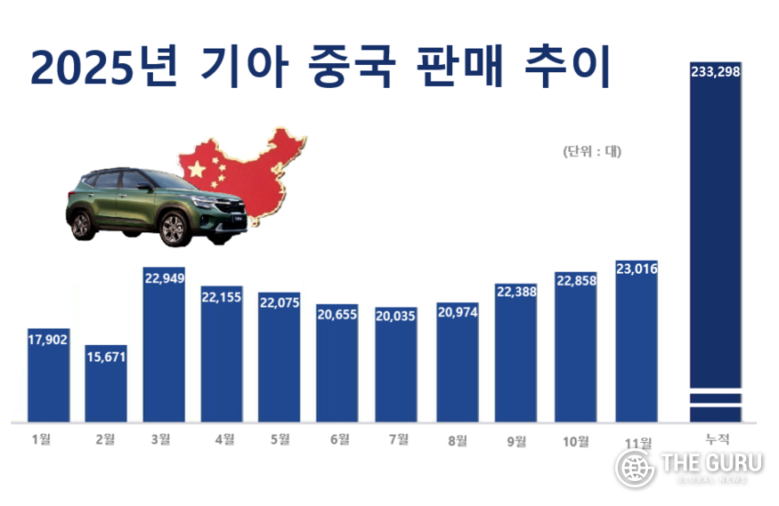 [더구루=김예지 기자] 기아가 중국 시장에서 9개월 연속 ‘월 2만대’ 판매를 이어가며 올해 최고 월간 판매 실적을 기록했다. 누적 판매도 전년 대비 증가세를 유지하며 연말 25만대 돌파 가능성이 더욱 커졌다는 분석이다. 이는 중국 내수 회복과 함께 현지 생산기지를 글로벌 수출 거점으로 전환한 전략이 주효한 것으로 보인다.