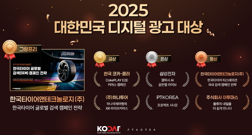 또한 한국타이어앤테크놀로지(주)의 ‘2025 한국타이어 티스테이션 국내 검색 캠페인 전략’과 이투마스의 ‘물류의 내일을 더 쉽게 만나다’ 캠페인도 각각 검색퍼포먼스, 디지털영상 부문에서 동상을 받았다.