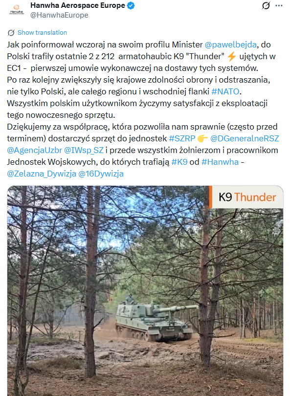폴란드 국방부도 1차 공급 계약에 따른 이행 완료를 확인했다. 파벨 베이다(Pavel Bejda) 폴란드 국방부 차관도 엑스(X)에서 "제1마주리아포병여단에 K9 자주포를 추가 인도했다"며 "이번 인도로 212문의 자주포 도입을 위한 제1차 집행 계약이 완료됐다"고 말했다.