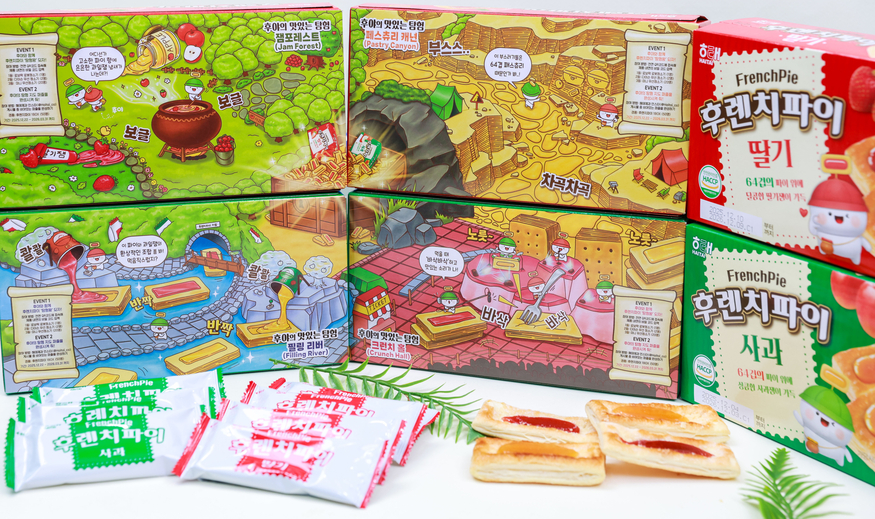 특히 후렌치파이 마스코트 ‘후야’가 패키지에 등장해 4개의 탐험 장소를 소개한다. 숲속 자연에서 온 과일잼의 상큼한 향을 강조한 ‘잼 포레스트’, 64겹의 페스츄리 협곡으로 특유의 바삭한 촉감을 연상시킨 ‘페스츄리 캐년’, 한입 베어 물때 바사삭한 소리를 콘서트홀 공연으로 비유한 ‘크런치 홀’, 페스츄리 위에 반짝이는 잼이 채워지는 모습을 담아 먹음직스러운 비주얼을 어필한 ‘필링 리버’ 등이다. 그림을 모두 모으면 후렌치파이의 매력 요소가 자연스럽게 연결된 하나의 감각 탐험 지도가 완성된다.