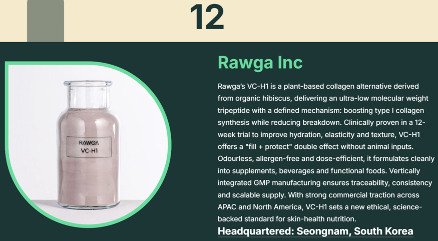 로가는 유기농 히비스커스에서 추출한 식물성 콜라겐 대체 원료 VC-H1으로 높은 점수를 받았다. VC-H1은 초저분자 트리펩타이드 구조를 기반으로 타입 I 콜라겐 합성을 촉진하고 분해를 억제하는 명확한 작용 기전을 갖춘 것이 특징이다. 12주간 인체적용시험을 통해 피부 보습·탄력·결 개선 효과를 입증하며 과학적 신뢰도도 확보했다.