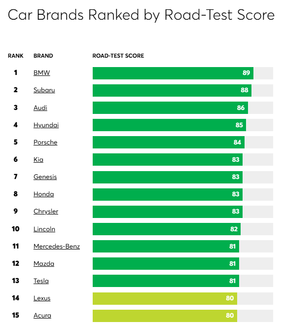 23일 컨슈머 리포트(Consumer Reports)에 따르면 현대차·기아·제네시스는 최근 발표된 자동차 브랜드별 로드테스트 점수(Road-Test Score) 평가에서 각각 4위(85점), 6위 (83점), 7위 (83점)를 기록하며 톱10에 모두 진입했다. 이번 평가는 컨슈머 리포트 전문가들이 50가지 이상의 엄격한 테스트를 통해 가속, 제동, 핸들링, 승차감 등 실제 주행 성능과 사용자 경험을 종합 평가한 결과다.