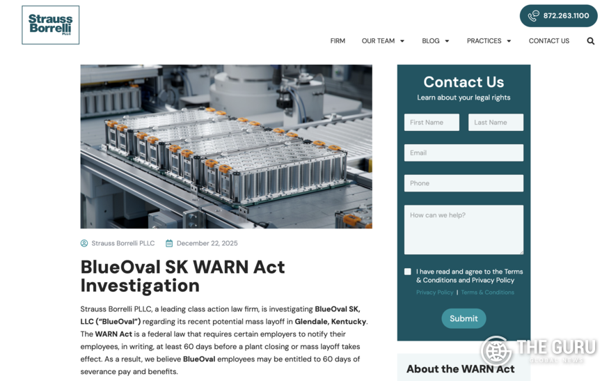 [더구루=정예린 기자] SK온과 포드의 미국 배터리 합작사 '블루오벌SK'가 켄터키주 공장 대규모 해고와 관련해 미국 노동법 위반 혐의로 집단소송 위기에 직면했다. 합작 청산 이후 켄터키 공장을 넘겨받는 포드가 구조조정을 사실상 주도한 것으로 해석되면서, 법적 책임의 초점도 포드로 이동하고 있다는 분석이 나온다.