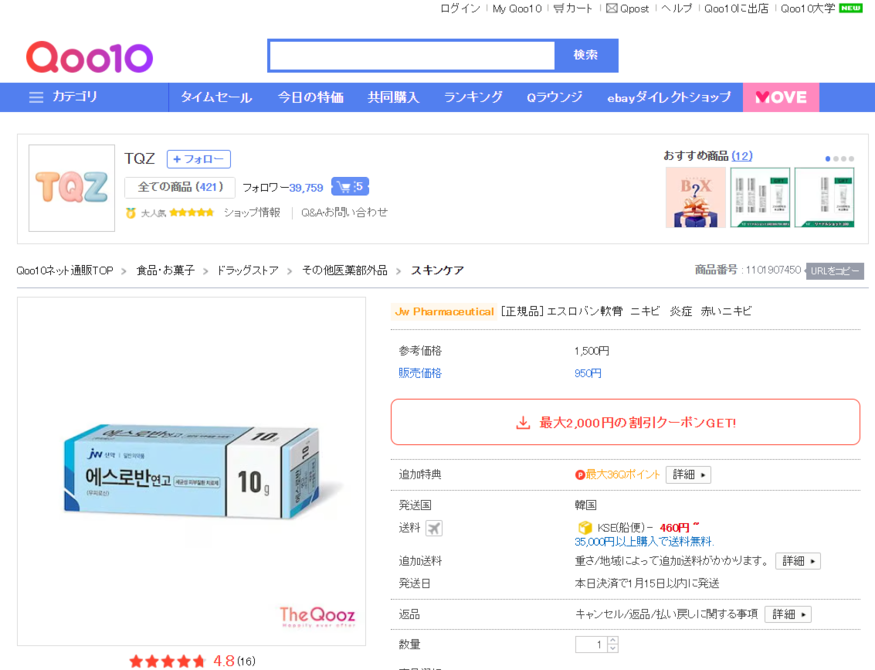 12일 큐텐에 따르면 JW중외제약이 에스로반 연고를 스킨케어·드러그스토어 카테고리에서 '정품' 표기를 내걸고 판매를 시작했다. 대부분 10g 단위 제품으로, 판매가는 1000엔 안팎으로 형성돼 현지 외용 항생제 대비 가격 부담을 낮췄다. 현재 판매는 국내 유통업체들이 큐텐에 입점해 각각 유통·판매하는 형태로 이뤄지고 있으며, 한국에서 일본으로 발송되는 크로스보더 거래 방식이 적용되고 있다.