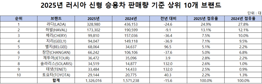 현재 러시아 자동차 제조사 아브토바즈 산하 라다가 여전히 시장 1위를 지키고 있지만, 판매 상위 10개 브랜드 가운데 6개를 중국 업체가 차지하며 시장 영향력을 빠르게 확대하고 있다. 이는 러시아 자동차 시장이 중국 중심으로 재편되고 있음을 보여주는 상징적인 사례로 풀이된다.