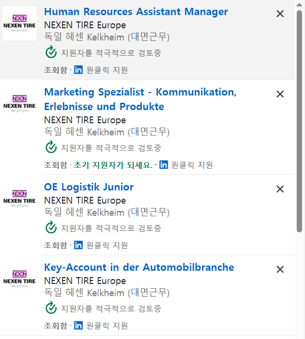 20일 링크드인에 따르면 넥센타이어 유럽판매법인은 최근 독일 켈크하임(Kelkheim) 지점 신규 인력 모집에 나섰다. 모집 분야는 △마케팅 전문가(커뮤니케이션·경험·제품 담당) △신차용 타이어(OE) 물류 주니어 △인사 부문 부매니저 △주요 고객사 담당자 등 4개 직군이다.
