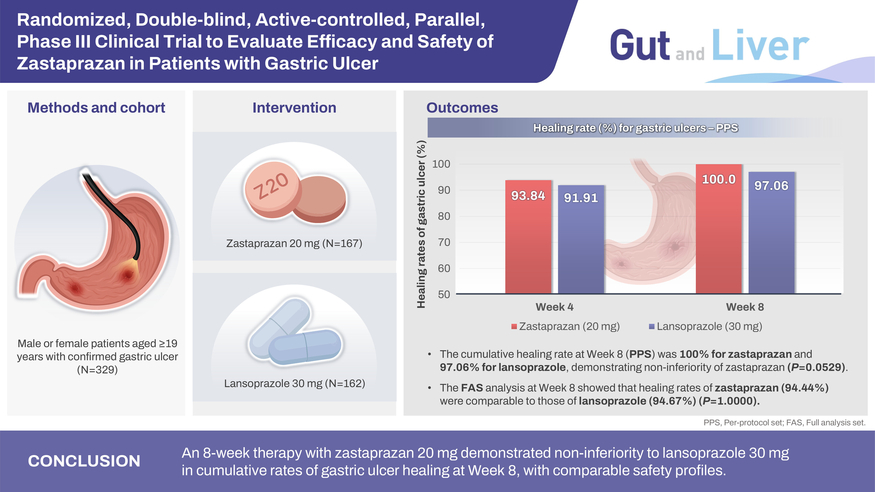 이번 연구는 국내 39개 의료기관에서 위궤양 환자 329명을 대상으로 수행된 무작위 배정, 이중맹검 임상시험으로, 자큐보 20 mg을 최대 8주간 투여해 치료 효과와 안전성을 종합적으로 평가했다.