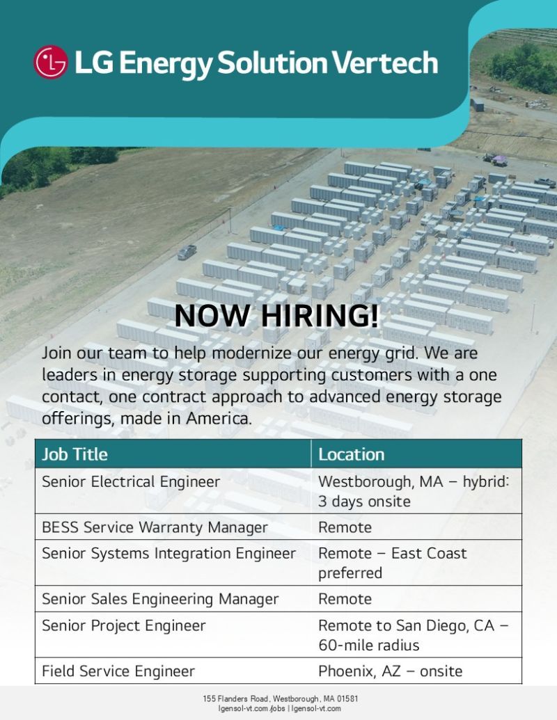 구체적으로는 △ 시니어 전기 엔지니어(매사추세츠주 웨스트버러, 혼합형 근무) △ BESS 서비스 워런티 매니저·시니어 기술 영업 매니저(원격 근무) △ 시니어 시스템 통합 엔지니어(미 동부 지역 거주자 우대, 원격 근무) △ 시니어 프로젝트 엔지니어(캘리포니아주 샌디에이고 반경 60마일 이내 거주자, 원격 근무) △ 필드 서비스 엔지니어(애리조나주 피닉스, 현장 상주)이다.