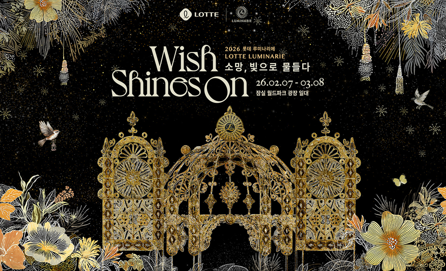 2일 롯데물산에 따르면 작년에 이어 2회째를 맞이한 ‘2026 롯데 루미나리에’는 롯데물산이 롯데지주와 함께 준비한 새해 첫 이벤트다. 루미나리에(Luminarie)는 ‘빛’ 또는 ‘조명’을 뜻하는 이탈리아어로, 조명을 이용해 건축물을 만들거나 꾸미는 빛 축제를 의미한다. 올해 루미나리에 테마는 새봄을 기다리는 2월, 모두의 소망이 이뤄지길 바라는 마음을 담아 ‘Wish Shines On(소망, 빛으로 물들다)’으로 정했다.