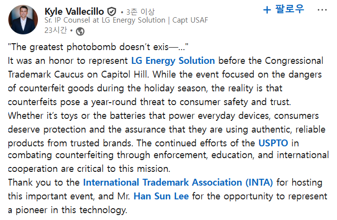 2일 업계에 따르면 카일 바렐실로(Kyle Vallecillo) LG에너지솔루션 시니어 IP 사내변호사는 최근 국제상표협회(International Trademark Association·이하 ITA)의 주최로 미국 워싱턴D.C 국회의사당에서 열린 토론회에 패널로 나섰다.