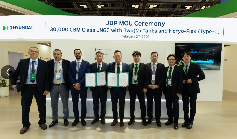 로이드선급은 2일(현지시간) 카타르 도하 소재 카타르 국립 컨벤션 센터(QNCC)에서 열리는 'LNG 2026'에서 HD현대중공업과 화물탱크 최대화와 '하이크로-플렉스(Hycro-flex)' 기술을 적용한 3만 ㎥급 LNG 운반선 상용화를 위해 공동 개발(Joint Development Project) 업무협약(MOU)을 체결했다고 밝혔다.