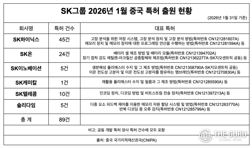 [더구루=정예린 기자] SK그룹이 지난달 중국에서 반도체·배터리·스토리지·통신 인프라 전반에 걸친 특허를 승인받았다. 반도체·배터리·통신 인프라 등 주력 사업에서 기술 장벽을 높이고, 중국 내 생산·사업 전개 과정에서 공정 신뢰성과 운영 효율을 함께 끌어올리는 기반을 마련할 것으로 기대된다.