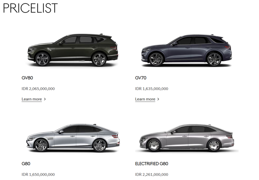 현지에서 공개된 모델별 가격은 프리미엄 브랜드다운 높은 가격대를 형성 중이다. 자카르타(DKI Jakarta)지역 기준 △GV70 16억3500만루피아(약 1억4077만원) △G80 16억5000만루피아(약 1억4206만원) △ GV80 20억6500만루피아(약 1억7759만원) △일렉트릭파이드 G80 22억6100만루피아(약 1억9445만원) 등이다.
