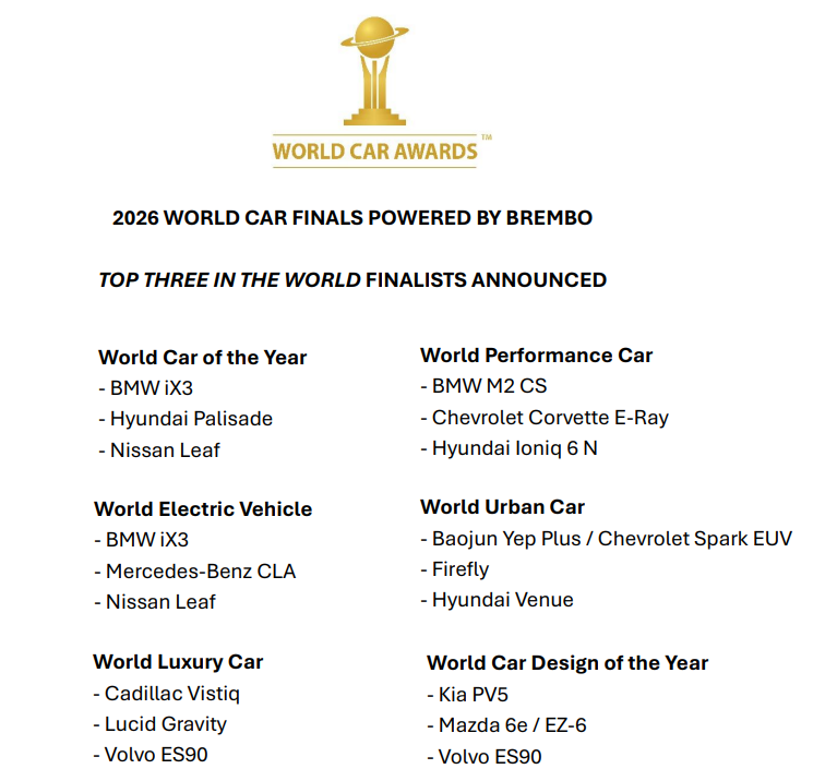 고성능 부문인 '월드 퍼포먼스 카(World Performance Car)'에는 현대차 아이오닉 6 N이 후보에 올랐다. 도심형 차량 부문인 '월드 어반 카(World Urban Car)'에는 현대차 베뉴(Venue)가 최종 결선에 올랐고, 디자인 부문인 '월드 카 디자인 오브 더 이어(World Car Design of the Year)'에는 기아 PV5가 최종 후보로 선정됐다.