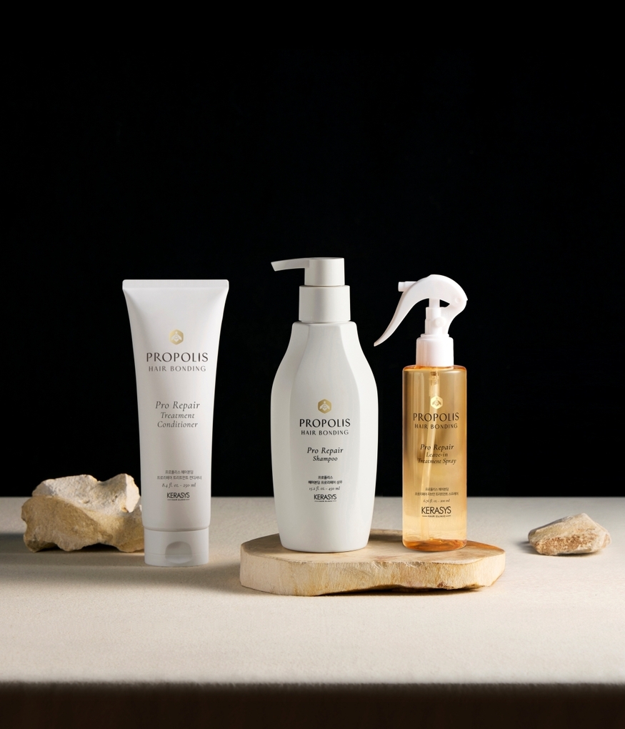 케라시스 프로폴리스 헤어본딩 라인 3종은 △밀착감 있는 제형으로 영양 공급과 함께 풍성한 거품으로 부드러운 클렌징이 가능한 ‘프로리페어 샴푸’ △벌어진 큐티클 틈 사이에 적용해 모발을 매끄럽고 부드럽게 관리해 주는 ‘프로리페어 트리트먼트 컨디셔너’ △미세한 앰플 입자가 적용된 스프레이 타입으로 헹굼 없이 끈적이지 않는 영양을 공급해 주는 ‘프로리페어 리브인 트리트먼트 스프레이’로 구성됐다.