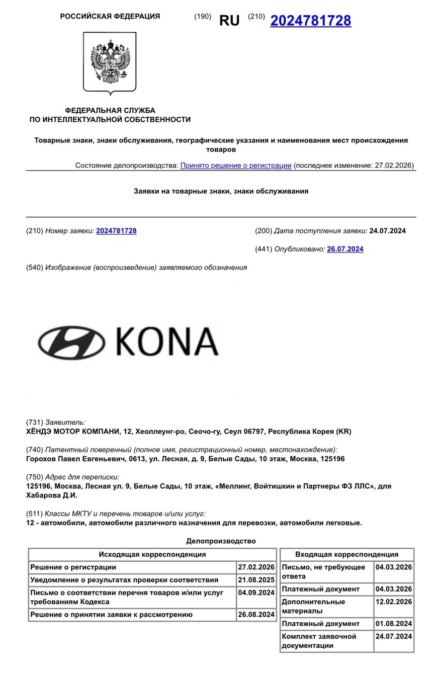 11일 러시아 연방산업재산권연구소(FIPS)에 따르면 현대차는 지난달 27일자로 크로스오버 모델인 '코나'에 대한 상표 등록 결정을 받고 관련 절차를 마무리했다. 이번 상표권(출원번호 2024781728)은 지난 2024년 7월 출원 이후 약 1년 8개월간의 심사를 거쳐 최종 승인됐다. 이로써 현대차는 오는 2034년까지 러시아 내에서 코나 명칭을 사용한 자동차 생산 및 판매에 대한 법적 권리를 확보하게 됐다.