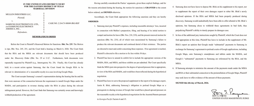 12일 미국 텍사스 동부 연방법원에서 발행한 결정 명령서(Memorandum Order)에 따르면 재판부인 로이 S. 페인 치안판사는 삼성전자가 원고인 뮬렌과의 소송 과정에서 구글과 체결한 수익 공유 계약(RSA) 및 모바일 서비스 인센티브 계약(MSIA)의 제출을 거부했다고 판시했다. 법원은 삼성이 해당 문서들의 관련성을 인지하고 있었음에도 증거 개시 명령에 따른 제출 의무를 이행하지 않았다고 지적하며 뮬렌 측의 제재 신청을 승인했다.