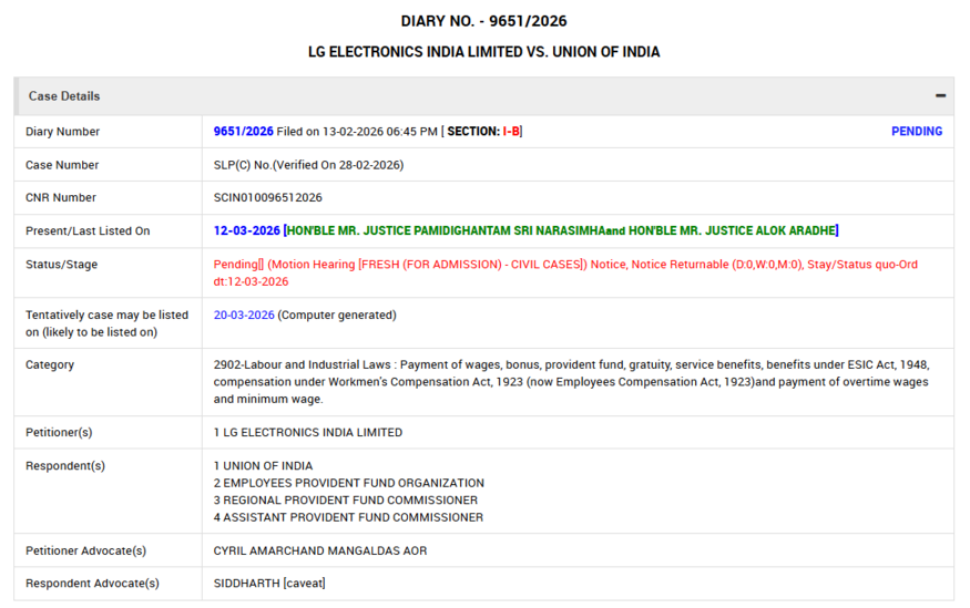 13일 인도 대법원에 따르면 대법원 재판부(파미디간탐 스리 나라심하·알록 아라데 판사)는 LG전자 인도 법인이 외국인 파견 근로자의 EPF 가입 의무화 규정인 시행령 제83항의 유효성에 이의를 제기하며 제출한 특별허가청원(SLP, 사건번호 9651/2026)을 접수하고 첫 심리를 전날 진행했다.