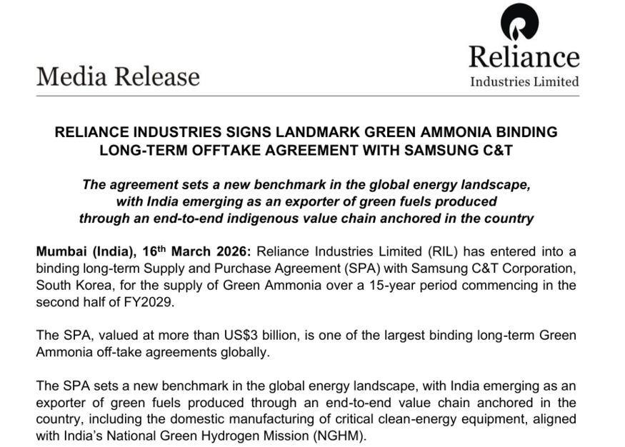 이번 계약은 저탄소 연료 채택을 확대하려는 글로벌 흐름 속에 이뤄졌으며, 전 세계 친환경 암모니아 구매 계약 중 역대 최대로 꼽힌다. 통신으로 시작된 삼성과 릴라이언스 인더스트리의 파트너십이 친환경 에너지로 넓어졌다는 점에서도 의미가 있다.