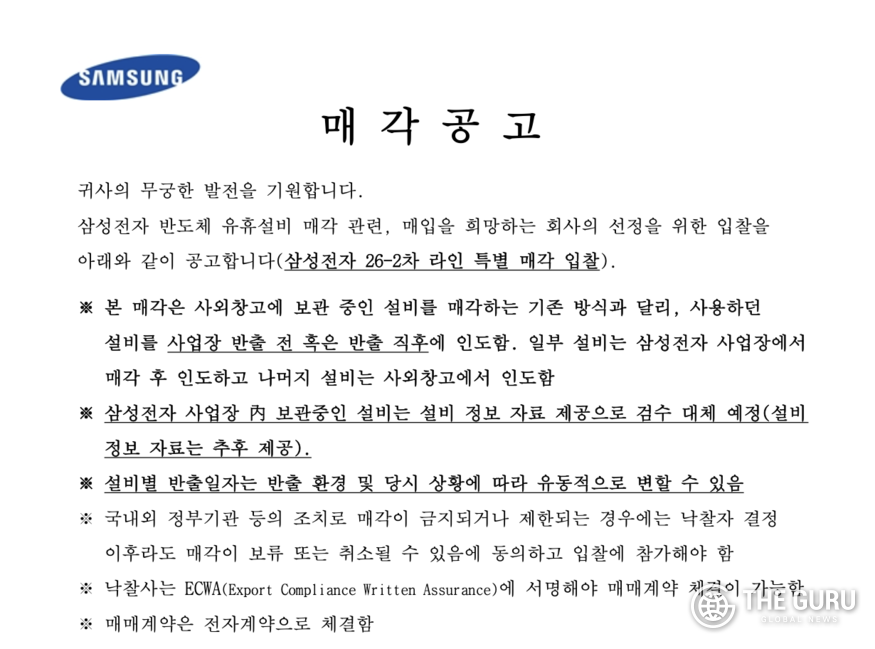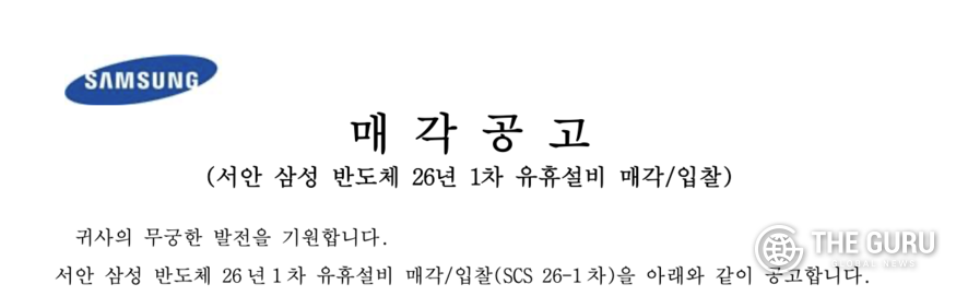 [더구루=정예린 기자] 삼성전자가 국내외 주요 반도체 생산 거점에서 사용하던 유휴 반도체 장비를 동시에 시장에 내놨다. 한국과 중국 공장의 공정 전환과 장비 교체 과정에서 발생한 설비를 외부로 처분, 선단 공장 중심으로 포트폴리오를 재편하고 자산 효율을 높이는 데 속도가 붙을 전망이다.