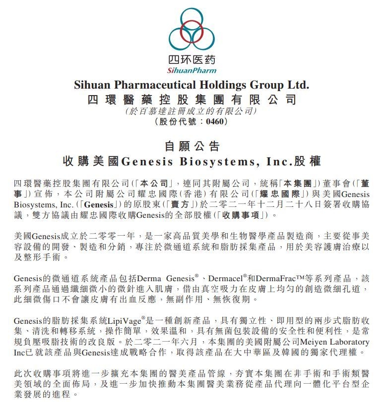 [더구루=길소연 기자] 휴젤 중국 파트너사인 사환제약(四环医药)이 미국 제네시스 바이오시스템즈를 인수, 메디컬 에스테틱 제품 라인을 강화한다.